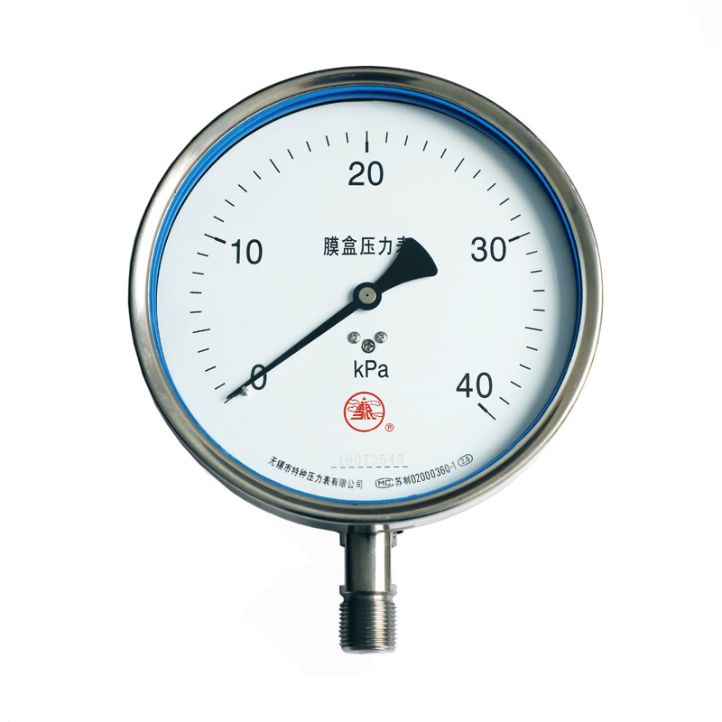 不銹鋼膜盒壓力表采用不銹鋼波紋膜盒作為測量微小壓力的敏感元件。不銹鋼膜盒壓力表適用于測量對不銹鋼不起腐蝕作用,無爆炸危險的氣體或液體的微小壓力。表盤上面有調零裝置,可以方便調整零位。不銹鋼膜盒壓力表廣泛應用于石油、化工、冶金等工業部門壓力測量,不銹鋼膜盒壓力表可以就地安裝并現場指示壓力。本公司可根據用戶需要,設計、制造特殊用途的不銹鋼膜盒壓力表產品,歡迎來人來電、來函洽談!