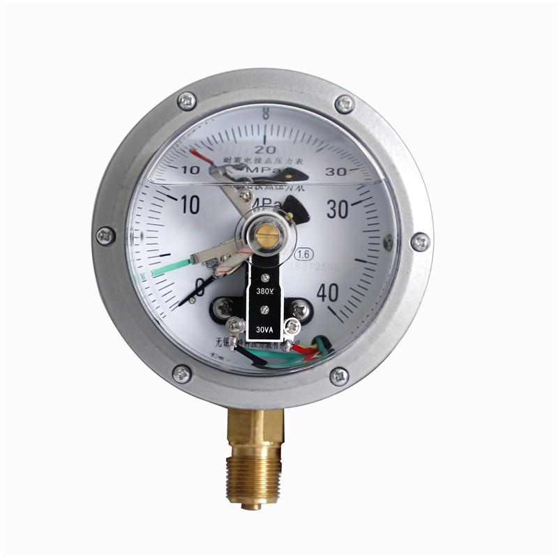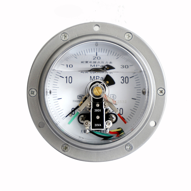 耐震電接點壓力真空表具有抗介質脈動和沖擊載荷,耐環境振動等優異特性,適用測量對銅和銅合金無腐蝕性的氣體,液體或蒸汽等壓力或真空度,一只表可同時測量壓力和真空。儀表設上、下限二位開關型接點裝置(可選雙上限或雙下限接點裝置),在壓力達到設定值時發出信號或通斷控制電路,供作業系統自動控制或發訊用。其抗振結構可有效抑制指針的抖動、沖擊,保護接點,使儀表指示清晰,電信號切換可靠,工作穩定。廣泛應用于機械、化工、石油、冶金、電力等工業生產過程壓力測量和控制。